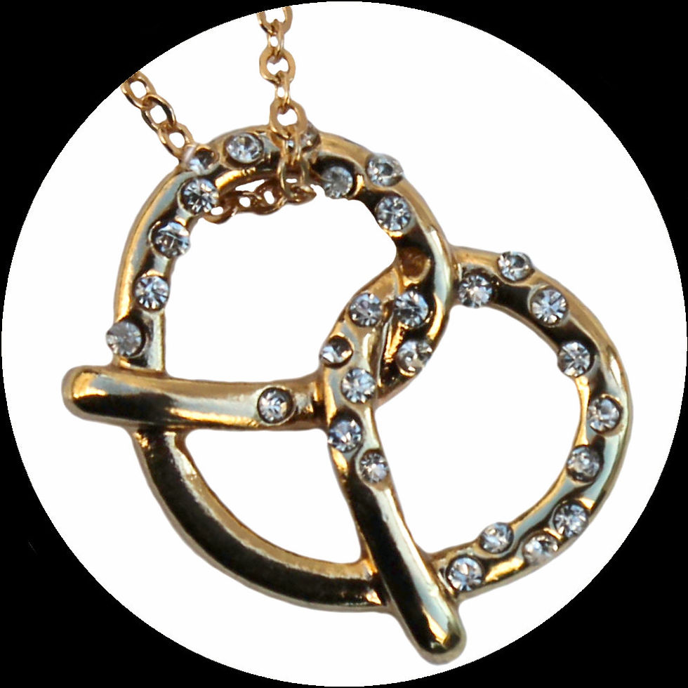 Gold-plated pretzel necklace with grains of salt made from white crystals