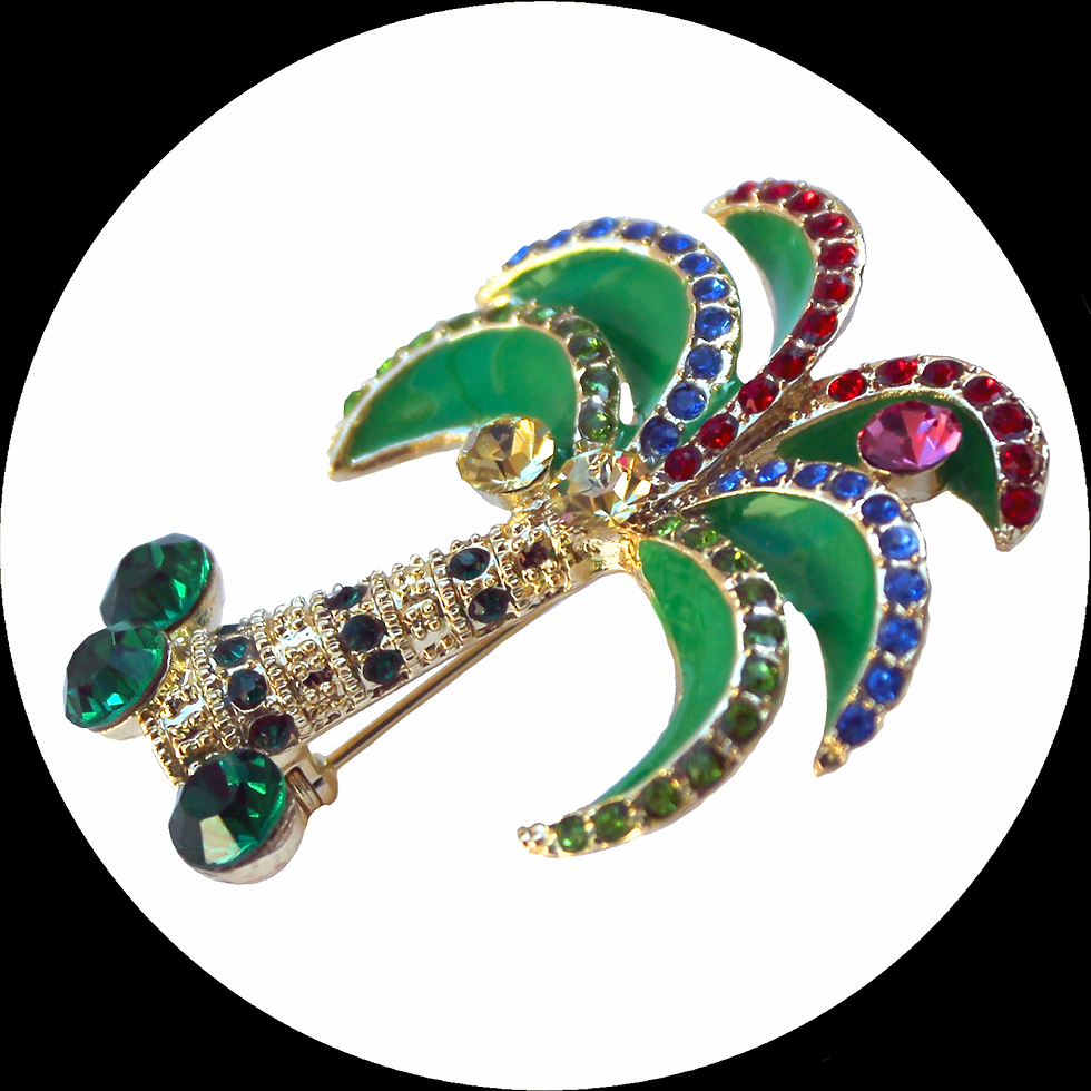Green enamelled palm tree brooch with colourful crystals in gold-coloured metal